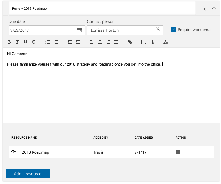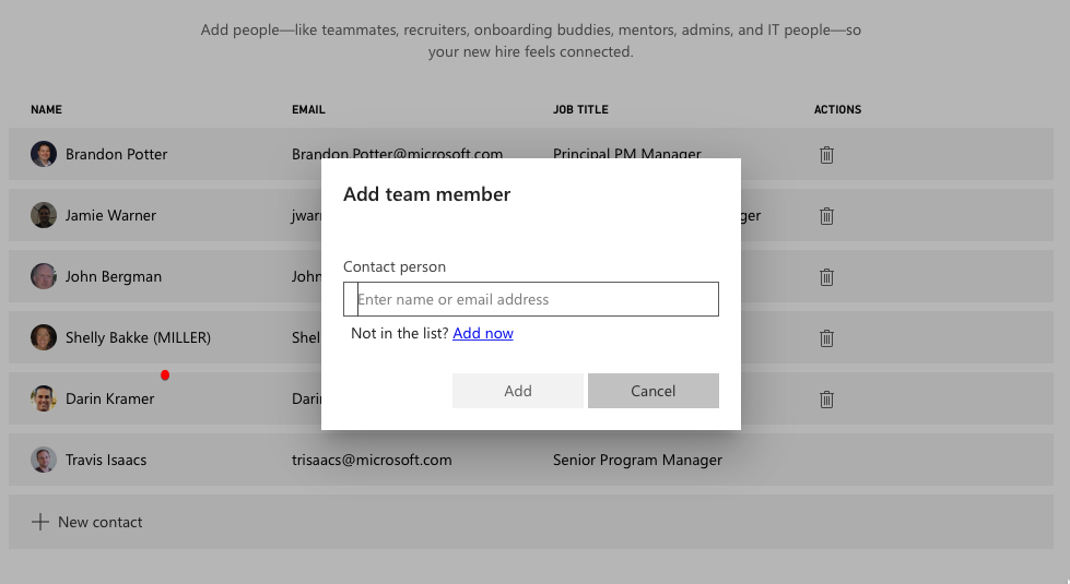 Dynamics 365 for Talent allows you to create a list of key contacts, complete with name, contact information, and photo and share it with new hires ahead of time. It's great to show up on your first day and put faces to names.