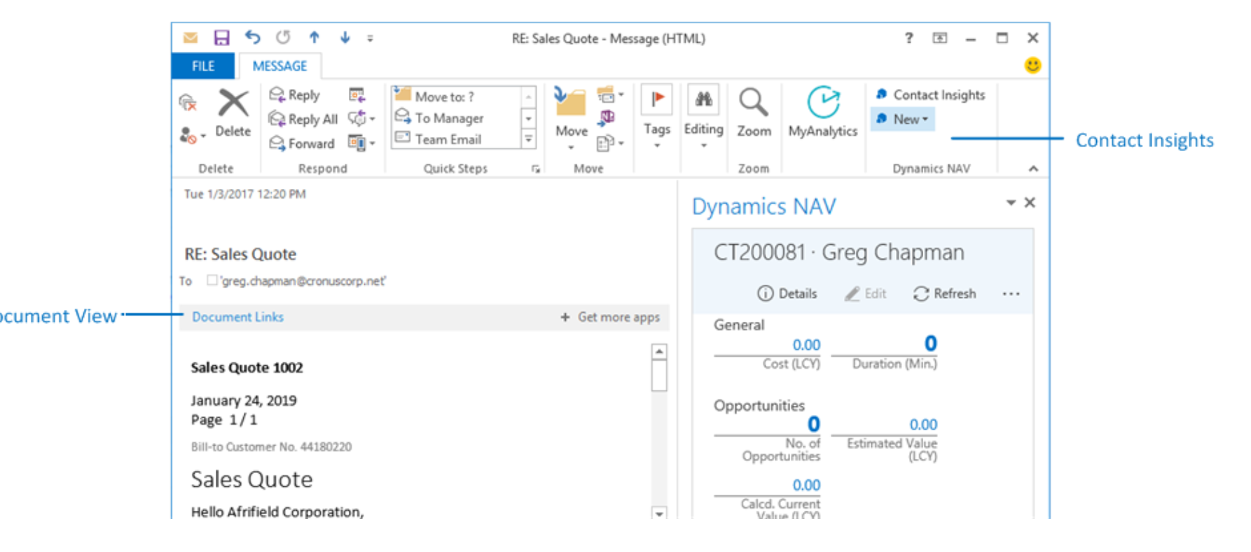 This add-in provides users with Dynamics NAV customer or vendor information in Outlook emails and calendar appointments. It also enables users to create and send Dynamics NAV business documents, such a sales quotes and invoices to a contact. To support these task, the add-in adds actions to the Outlook ribbon, in the Dynamics NAV group.