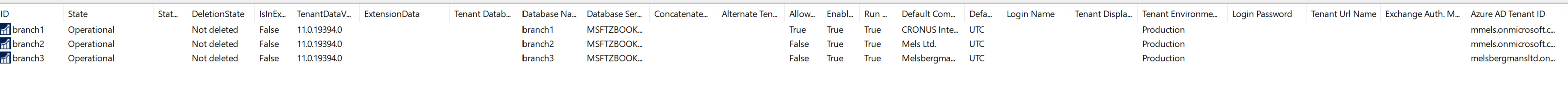 Mount-NAVTenant -ServerInstance COMMONMT -Tenant branch1 -DatabaseName branch1 -DatabaseServer MSFTZBOOK15G3 -DatabaseInstance NAVDEMO -AadTenantId mmels.onmicrosoft.com -DefaultCompany 'CRONUS International Ltd.' -DefaultTimeZone UTC -EnvironmentType Production -AllowAppDatabaseWrite -NasServicesEnabled -RunNasWithAdminRights Mount-NAVTenant -ServerInstance COMMONMT -Tenant branch2 -DatabaseName branch2 -DatabaseServer MSFTZBOOK15G3 -DatabaseInstance NAVDEMO -AadTenantId mmels.onmicrosoft.com -DefaultCompany 'Mels Ltd.' -DefaultTimeZone UTC -EnvironmentType Production -NasServicesEnabled -RunNasWithAdminRights Mount-NAVTenant -ServerInstance COMMONMT -Tenant branch3 -DatabaseName branch3 -DatabaseServer MSFTZBOOK15G3 -DatabaseInstance NAVDEMO -AadTenantId melsbergmansltd.onmicrosoft.com -DefaultCompany 'Melsbergmans Ltd.' -DefaultTimeZone UTC -EnvironmentType Production -NasServicesEnabled -RunNasWithAdminRights