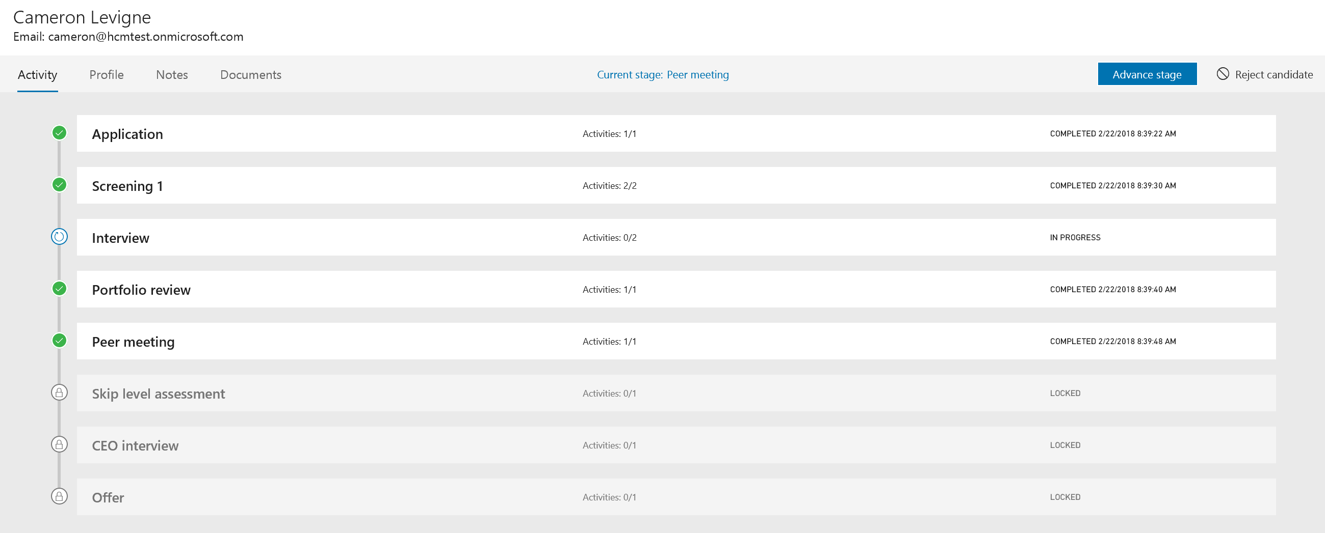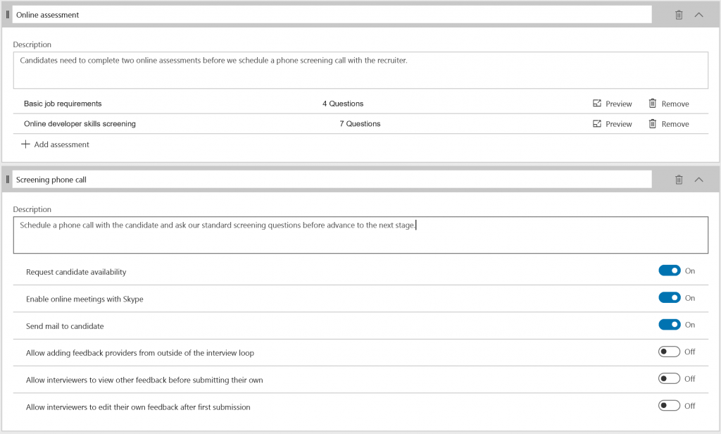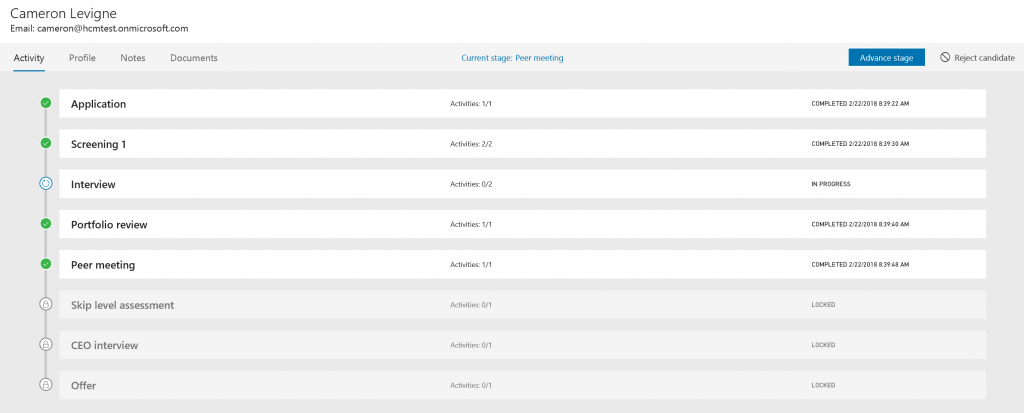 Collect information during the hiring process using Activities. As part of each step of the hiring process, you can define various activities, and their behavior, that need to be performed in order to collect information about your candidates. For example, you may want to require the candidate to complete an online assessment as well as a phone interview as part of a screening stage, or ensure that a background check is performed as part of the offer stage. Whatever is needed, you select the activities and configure the behavior in each stage to ensure you make an educated decision to reject or advance a candidate through your process. Out-of-the-box, Attract provides a growing list of activity types you can pick from and setup to fit your needs.