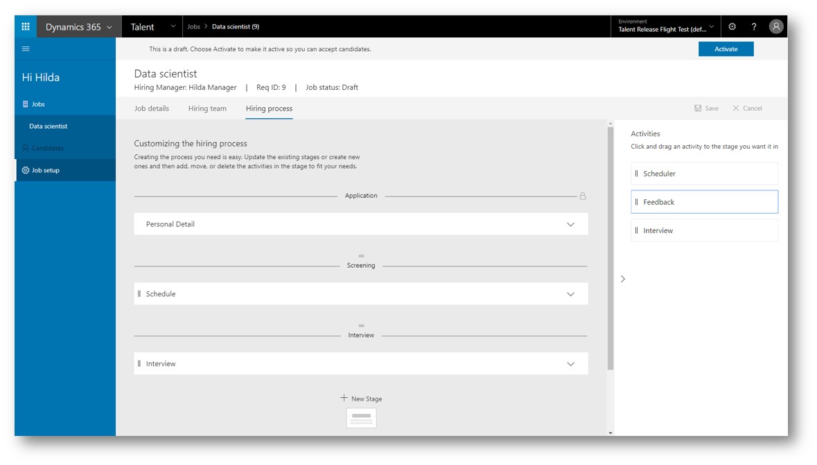 Start simple…then tailor hiring to your needs. Microsoft Dynamics for Talent: Attract doesn’t squeeze candidates into one blanket hiring process. Attract starts with a simple basic hiring process to help you get started quickly, paired with additional options to then configure the process for your unique requirements. Let’s explore the basic building blocks of configuring your hiring process.