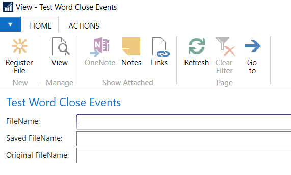 - In the FileName field type the path of the first file (C:\TEMP\BETA.docx) and click Register File action. The word document specified will open. NOTE: the page must not be closed.