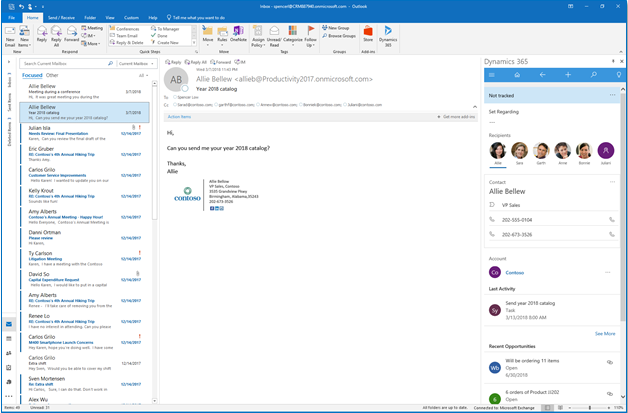 Dynamics 365 App for Outlook enables you to tap the power of Dynamics 365 in Outlook on the desktop, web, or phone. When Dynamics 365 App for Outlook is installed, you’ll see a Dynamics 365 pane or window next to a selected Outlook email message or meeting. You can view information from Dynamics 365 about the email recipients. Or with a single click, link an Outlook email message or appointment to a specific Dynamics 365 record. When you link an email message or appointment to a Dynamics 365 record, the Outlook record appears as an activity for that record in Dynamics 365.