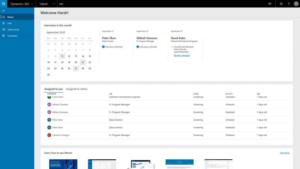 Dynamics 365 for Talent takes a modern approach to talent acquisition. We have digitally transformed the hiring experience to connect everyone on the hiring team – so you improve your quality of hire, while shortening the time to get them onboarded and impactful. Talent empowers recruiters to collaborate more effectively with hiring managers and offers the tools needed to treat candidates like VIPs.