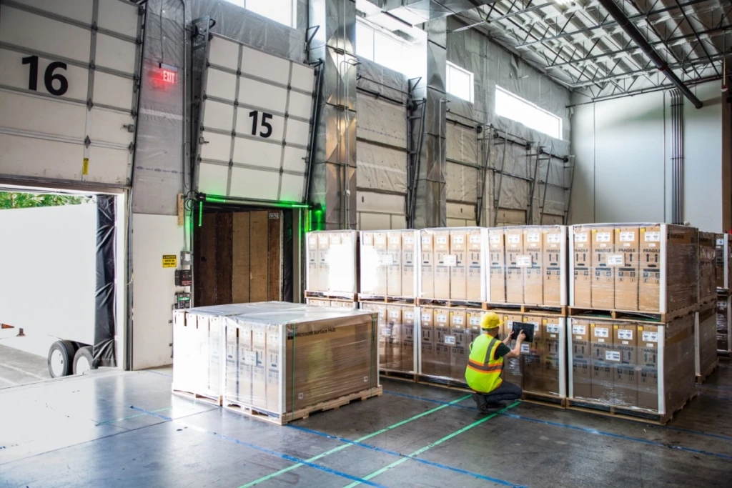 Male worker in hardhat and reflective vest using tablet in warehouse loading dock. Tablet screen not visible.