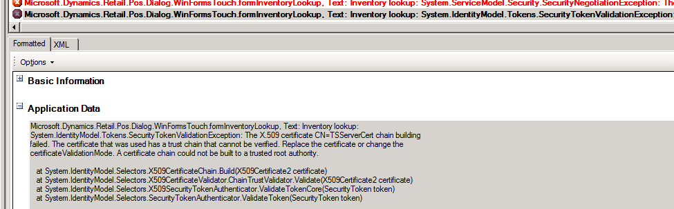 Problem: Call to the Real-time Service results in an error similar to (POS error log): System.IdentityModel.Tokens.SecurityTokenValidationException: The X.509 certificate CN=TSServerCert chain building failed. The certificate that was used has a trust chain that cannot be verified. Replace the certificate or change the certificateValidationMode. A certificate chain could not be built to a trusted root authority.