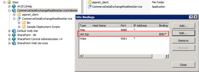 Solution: We have seen a couple instances where the net.tcp binding may not get created by the Powershell installation script. In the IIS Manager, go to your CommerceDataExchangeRealtimServiceWebsite note and right-click and select bindings:
