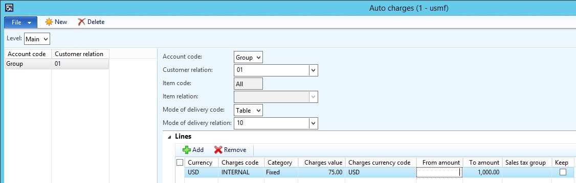 This content covers setting up and using sales order auto charges, where the auto charges are based on the total amount of the sales order. Assume that there is a business requirement of applying auto charges where the total of the sales order is equal 1000.00 USD. In order to map this requirement to Dynamics AX please review Sales order Auto Charges in Microsoft Dynamics AX.