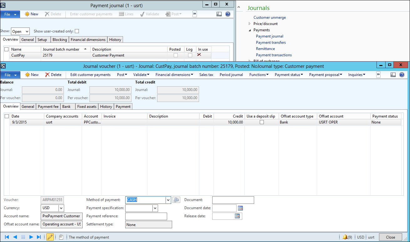 1. Create Prepayment Payment Journal for $10,000