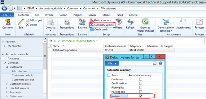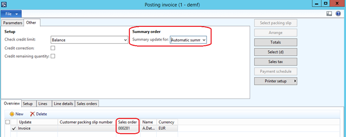 Go to Periodic| sales update| Invoice. Then retrieve customer sales orders, the system will retrieve the two sales orders in the lines. The summary update must be Automatic summary option.