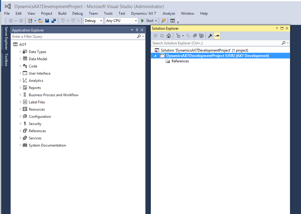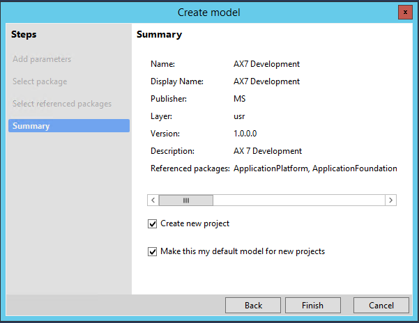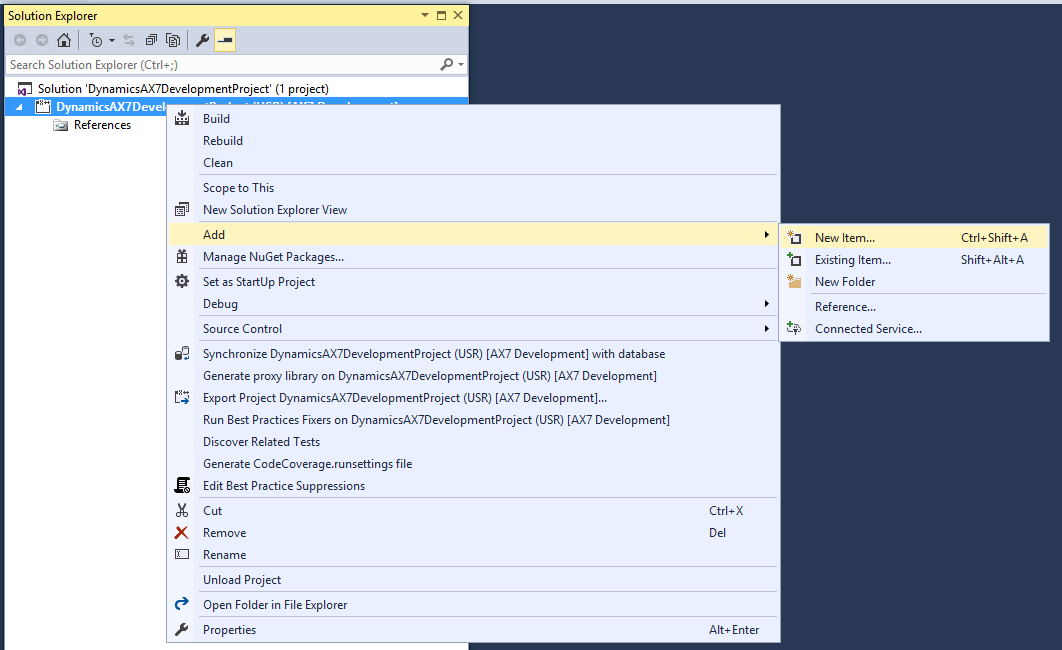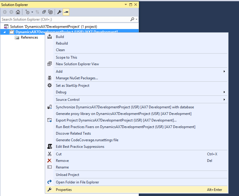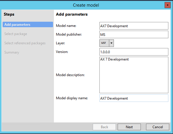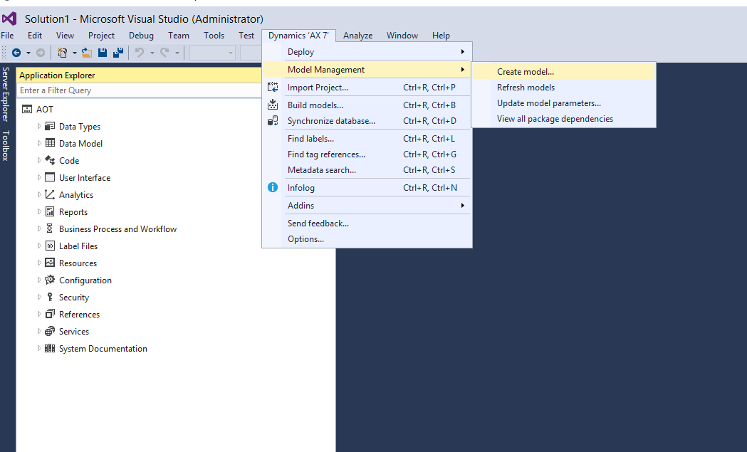 Once within Visual Studio, go to the AX7 menu and select Model Management and ‘Create model’. A model is not exactly the same as a layer, but it might be a useful analogy to think of it as being similar to a layer in the sense, it is a way to isolate and manage your customizations