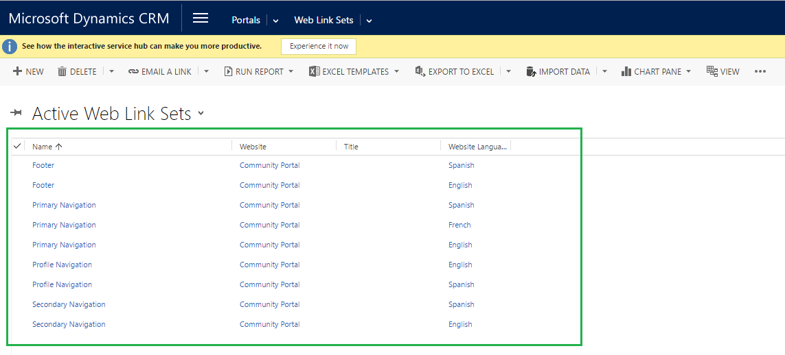 Web Link Sets are specific to a language. This gives you the ability to configure Primary Navigation, Profile Navigation, Secondary Navigation and Footer web link sets specific to each supported language. You can edit the web links part of these web link sets through CMS.