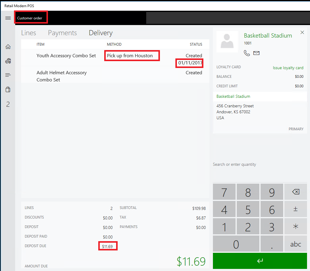 Note: You can see you have the deposit for the one Pick-up item and the Pick up Delivery Method displays on the line.