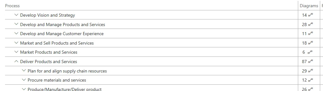 The Diagrams column in your BPM library indicates when a particular business process is associated with an activity diagram. The number indicates the number of child processes that include diagrams and the icon next to the number indicates whether the current node/process is associated with a diagram. These indicators do not apply to Visio diagrams.
