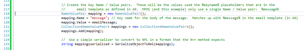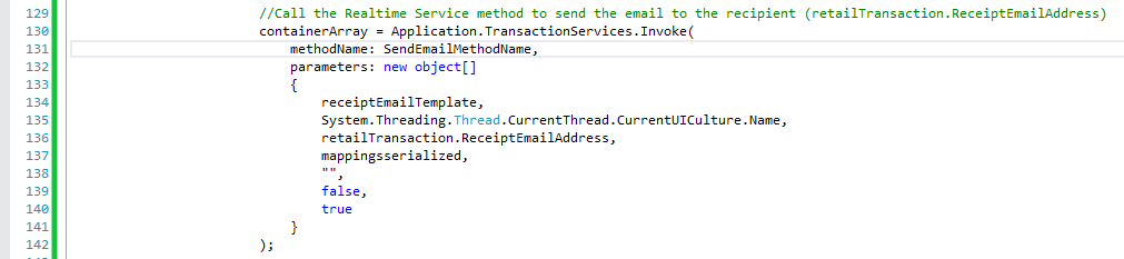 As a refresher, I talk about customizing Realtime Service (previously Transaction Service) in this blog post. In this case, the X++ work is already done for us since we’ll be using the same method that MPOS calls: SendEmail. A good place to add this call is in the PostEndTransaction trigger (in the TransactionTriggers project).