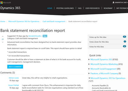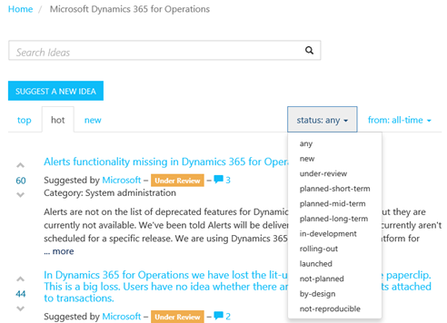 Please note that suggestions that were previously entered under the Dynamics ERP Feedback product in Microsoft Connect have been migrated over to the Ideas Portal. These are displayed as created by Microsoft.