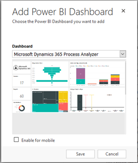- The Add Power BI Dashboard dialog opens. From the Dashboard drop-down list, choose the Microsoft Dynamics 365 Process Analyzer and click Save.