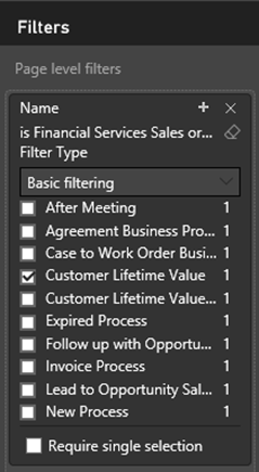 - Click on the Expand button for the Name filter (it looks like a hyphen; don’t click the delete-filter button, which is right next to it). The filter expands to show all the business-process names in use on your Dynamics 365 instance. Try marking the various checkboxes here and note how they affect the analytics shown in the main part of the screen. End by marking the checkbox for just one process name that shows interesting results. Your new page now provides analytics specific for your selected process only.