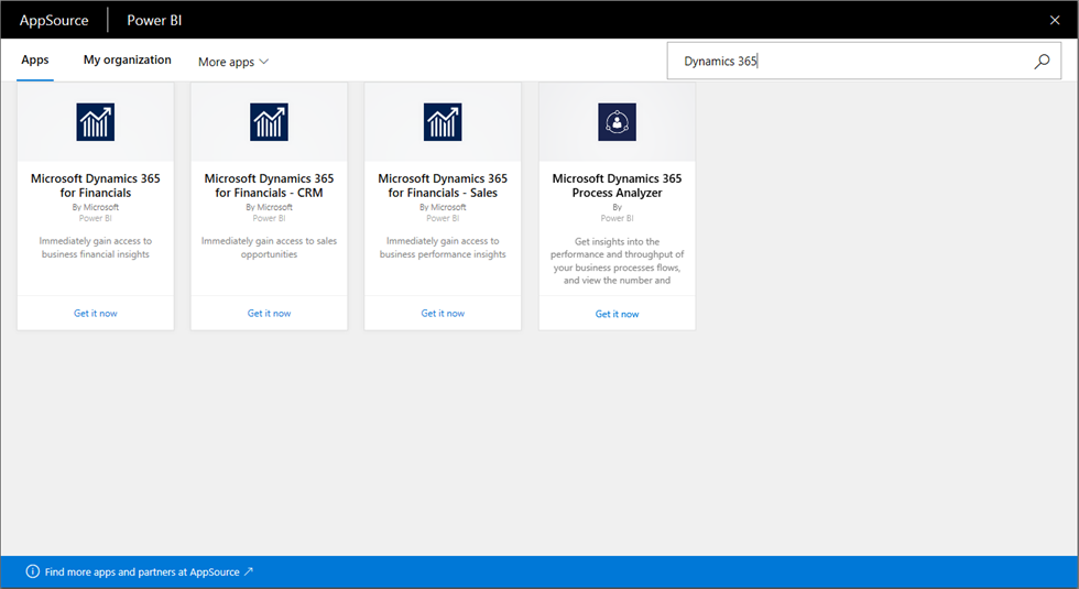 - The AppSource dialog opens. Use the search form here to find the Microsoft Dynamics 365 Process Analyzer and click Get it now.