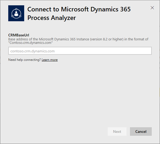 - The Connect to Microsoft Dynamics 365 Process Analyzer dialog opens. Enter the base domain name of your Dynamics 365 instance in the field provided (for example, “contoso.crm.dynamics.com”; don’t include “https://” or any path information).