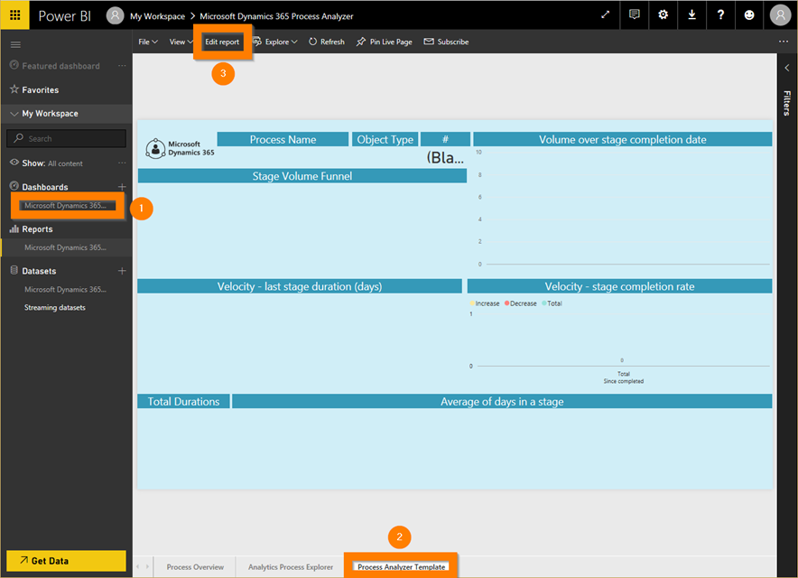 - Under the Reports heading in Power BI’s navigation pane, select the Process Manager report that you just added. Then select the Process Analyzer Template page (from the panel at the bottom of the report), and finally click on Edit Report in the toolbar at the top of the report. You now switch to the report-edit view.