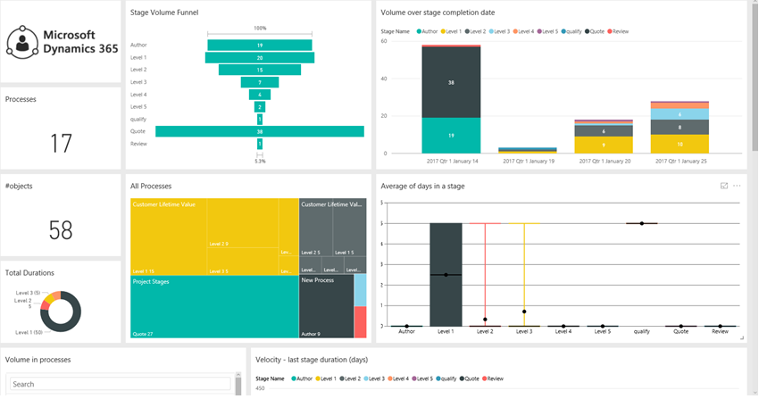 This content pack can help you monitor and analyze your business processes based on the detailed process information stored in your Dynamics 365 system. In this blog article, we’ll introduce this new content pack and show you how to get it, add a custom filter to one of its views, and embed the resulting visualization in your Dynamics 365 dashboard.