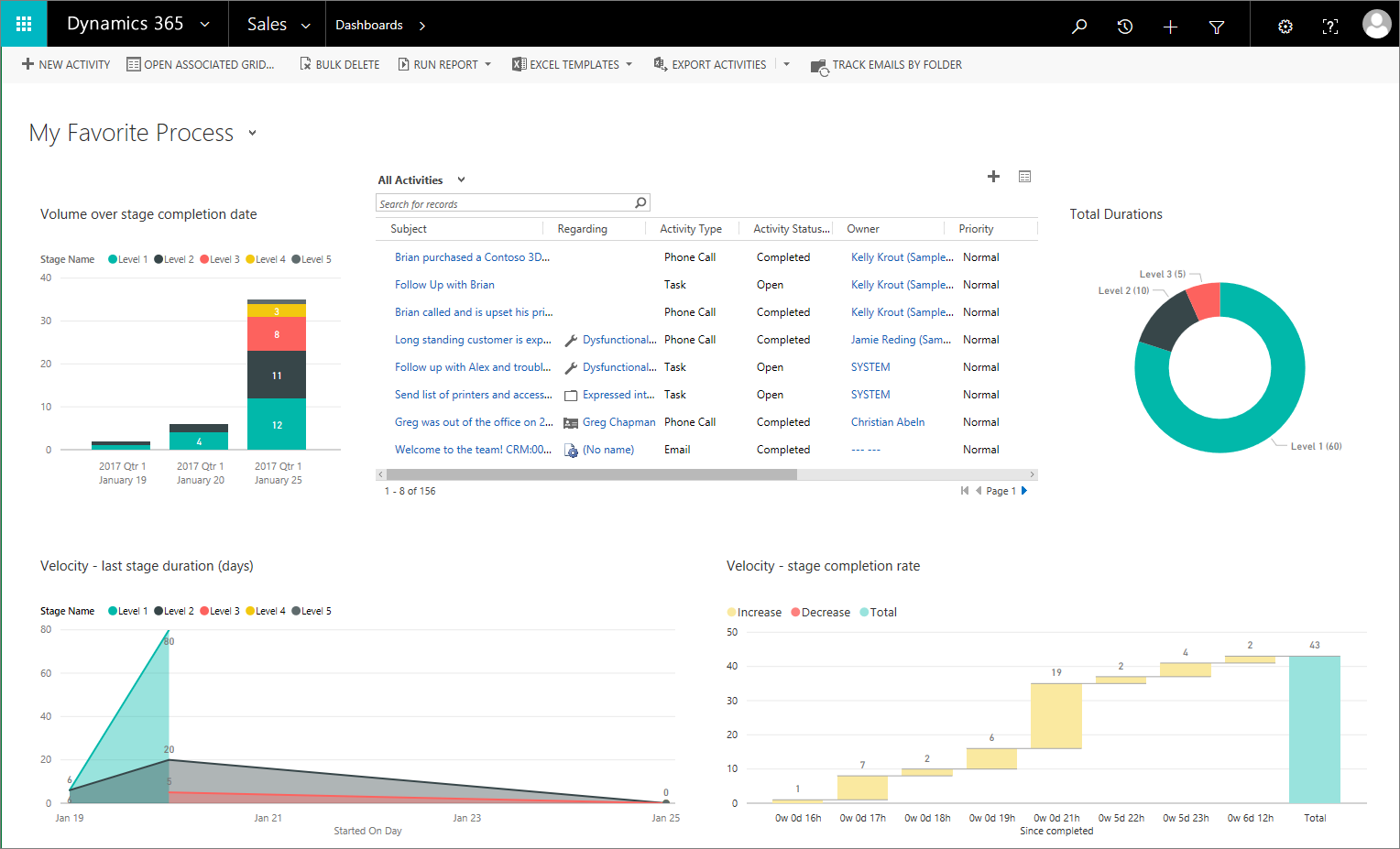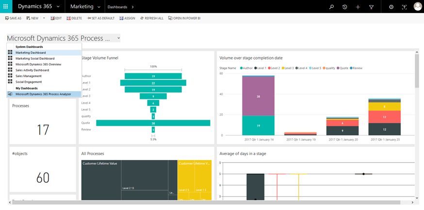 Create personalized business-process analytics that are most relevant to you and explore them using the Power BI portal - Embed and mix personalized business-process analytics in a Dynamics 365 dashboard