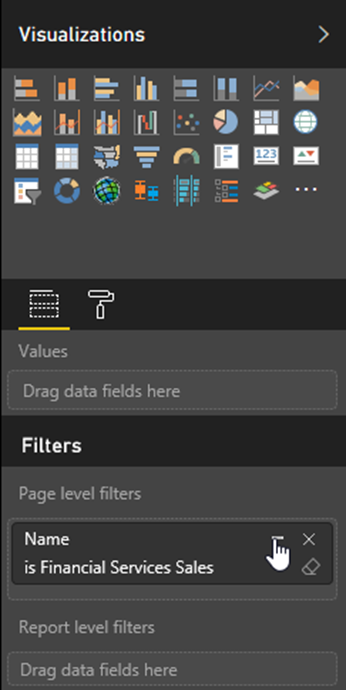 - With your new page selected, find the Filters heading in the Visualizations pane, which on the right side of the page; here you should see that there is a page-level filter called Name.
