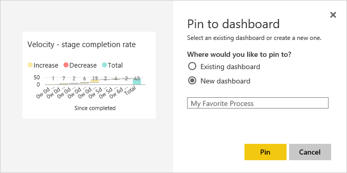 - The Pin to dashboard dialog opens. Choose the New dashboard radio button and then enter a name for your new dashboard in the field provided. Click Pin to create the new dashboard and add your selected tile to it. Power BI dashboards make your visuals accessible from other systems, such as Dynamics 365, and we’ll be taking advantage of this later in the blog article.
