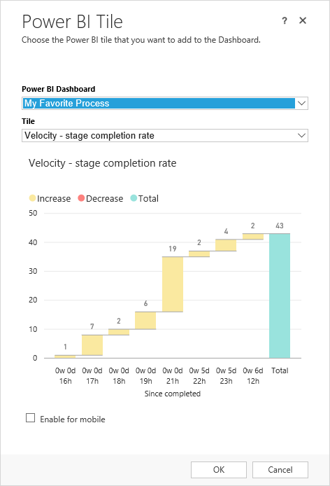 - The Power BI Tile dialog opens. From the Power BI Dashboard drop-down list, choose the name of the custom Power BI Dashboard that you just made. From the Tile drop-down list, choose the name of a tile from that dashboard that you want to add. Then click OK.