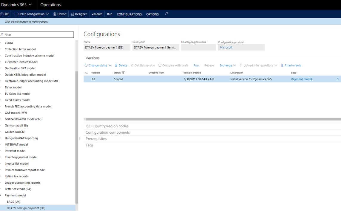 - Click Reporting configurations>>Select payment model (for example as importing DTAZV) in the left grid