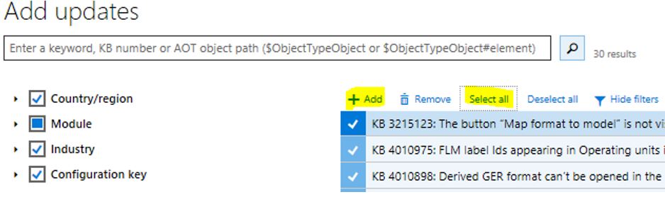 - 30 results are returned. Click ‘Select all’ and click +Add