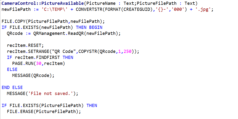 Last, but not least, when the PictureAvailable event is fired, implement some code that moves the picture into a specific folder – for better handling –, scan QR Code content and run the specific Page 30 “Item Card”, if this is recognized.