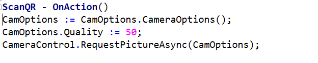 And create an action named “ScanQR” with the following properties and code