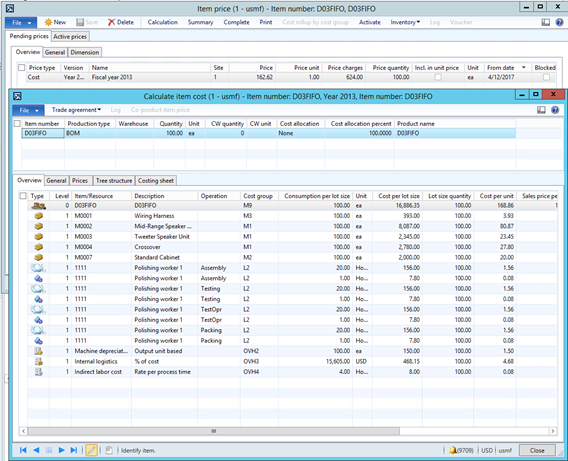 - Cost calculation is completed for a quantity of 100.00 of the finished good resulting in a cost per lot size of $16,886.35 or cost per unit for the subassembly of $168.86.