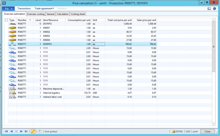 - Estimated cost on the production order for the subassembly is $786.62. Looking back at the cost calculation this should have been a red flag for this scenario since this is much higher than the cost calculation result.