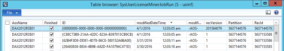 - On the application side, a new table SysUserLicenseMinerJobRun was created and is used to control the execution of this task in a multiple-AOS system (the task should be executed by only one AOS to save resources) and to hold the history on those executions.