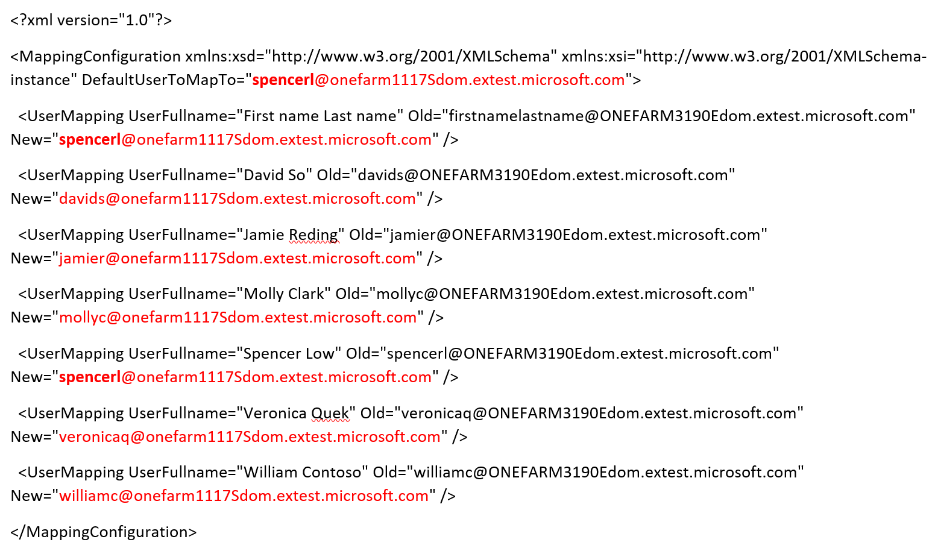You will also need to update a mapping file with email addresses of these users in your system. To do this, open the “PkgFolder” then find and open the ImportUserMapFile.xml file with Notepad (or Visual Studio or another XML editor). Within the file, set the DefaultUserToMapTo= field to the email address of your “Spencer Low” User, and the New= fields to the email addresses of corresponding Users in your system. As per the pictured example, the “First name Last name” user should also map to your “Spencer Low” User.