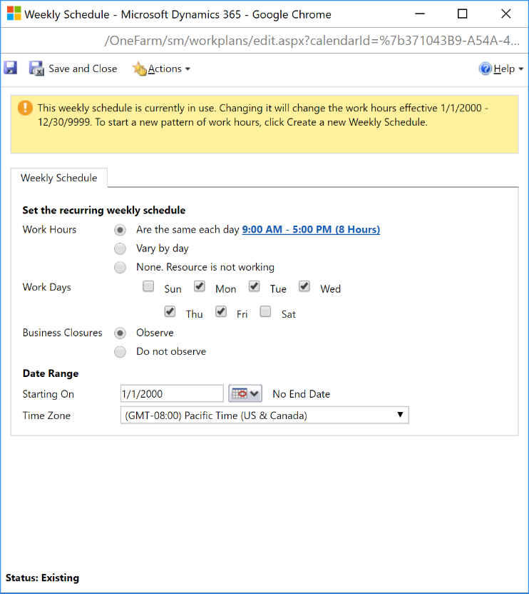 Edit the existing Work Hours, schedule, selecting the “Entire recurring weekly schedule from start to end” option, and make sure that the work hours are set to “9:00 AM – 5:00 PM (8 Hours)” with Monday through Friday and the Time Zone set to “Pacific Time (US & Canada). This is required to ensure that Schedule Board settings and already schedule Work Order and Project work appear correctly post installation.