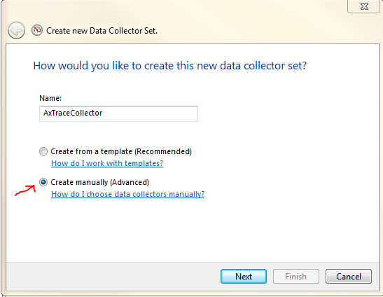 2. Give the Data Collector Set a name and select [Create manually] (you will be able to use “Create from a template” once you have a template created after going through the manual steps); click [Next].