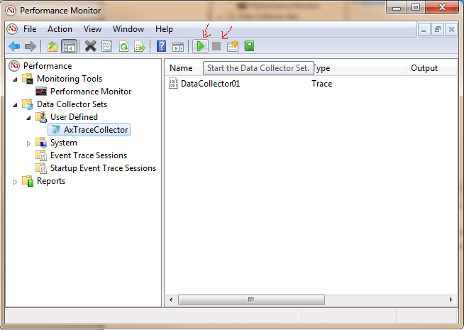 8. Now you can start or stop collecting AX event traces by clicking the start/stop buttons on the tool bar:
