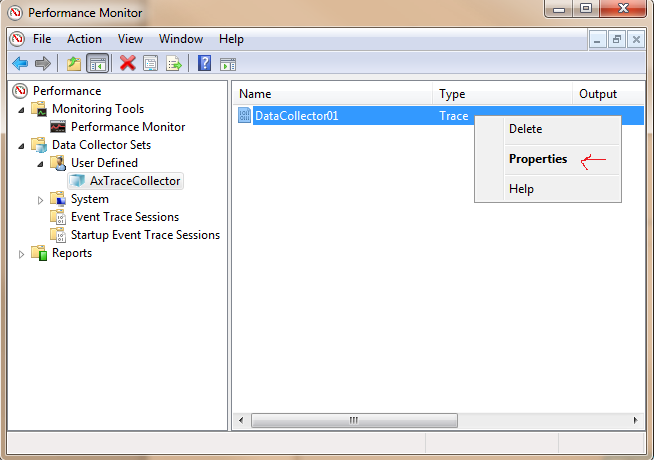 7. Now you need to modify some settings for the newly created data collector. Right click the “DataCollector01” in the right pane, and then click the [Properties] menu item: