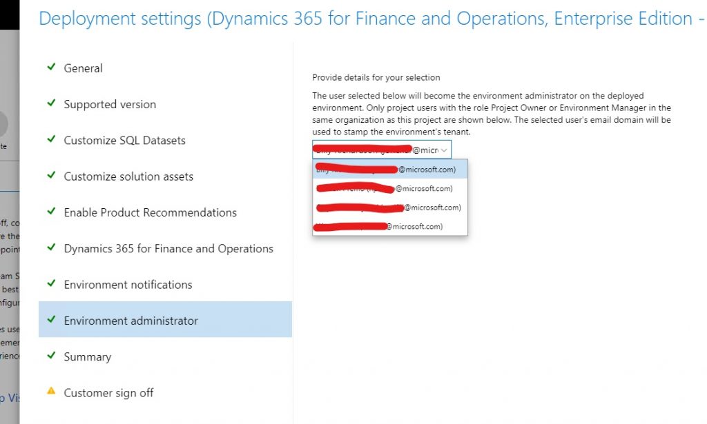 When you deploy a Dynamics 365 for Finance and Operations, Enterprise edition environment, you will notice that a new tab, Environment administrator, has been added. On this tab, you can add a project user to the Environment administrator role. The user’s email address domain is used as the environment’s tenant. For example, if you select [email protected], then the environment will be under the @contoso.com tenant. The environment administrator is the only person who has access to the environment after it is deployed. This means that the user will have to log in and add other users as needed. Only users who are in the same organization as the project and are assigned the role of Environment manager or Project owner are available to be added.