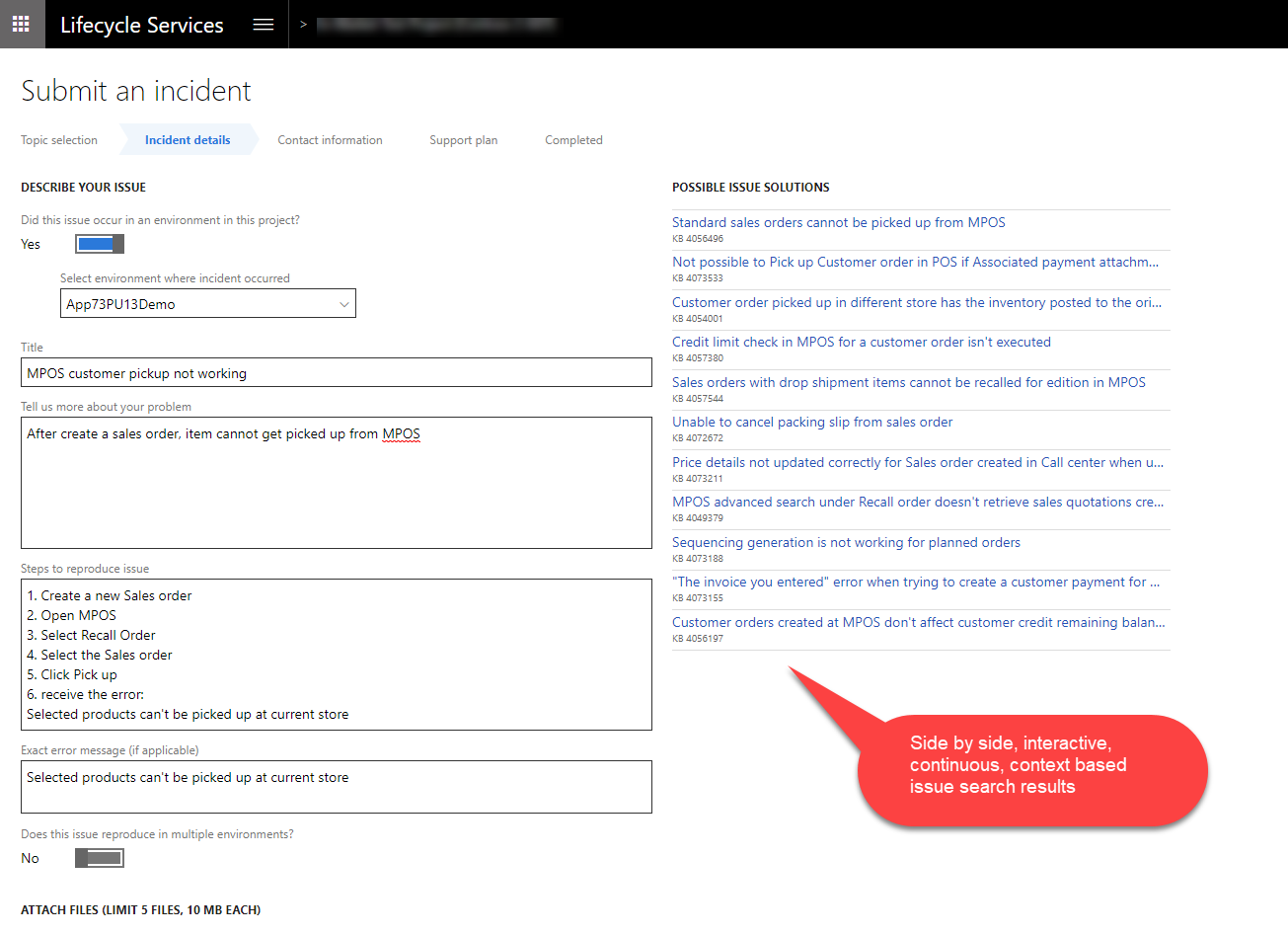 When you create a support case, instead of searching for existing solutions, LCS Support now populates the top 10 “Possible issue solutions” using issue search results based on your selection and input. The results are dynamically refreshed as the support case is created and more details are provided.