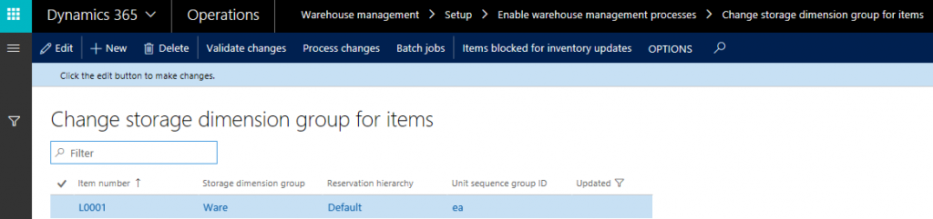 - The item must use a storage dimension group that is set up to use warehouse management processes which means that the Inventory status dimension, the location and the license plate must be active.