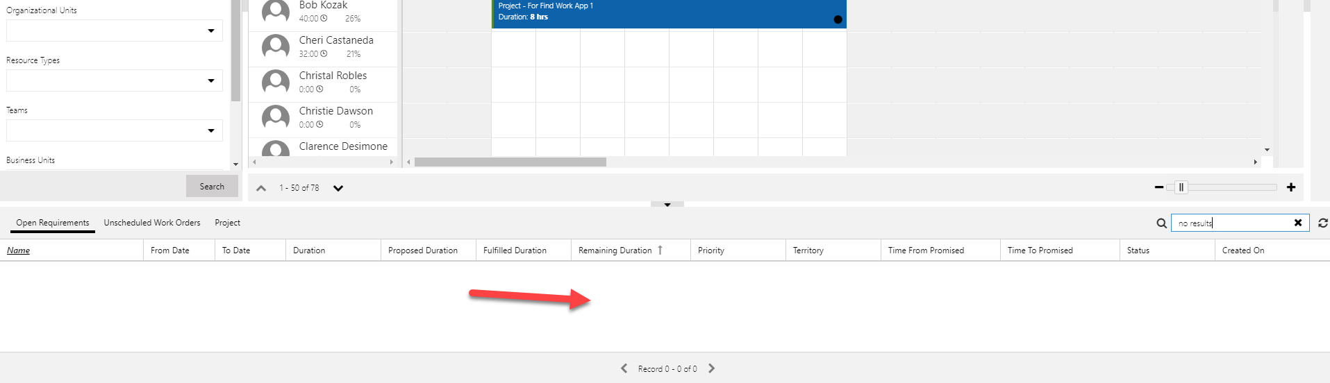 • Resource managers often search through the booking requirements grid at the bottom of the schedule board. We wanted to make the interaction more responsive in case there are no results that match the search criteria. Instead of whitespace, a message is shown to the user.