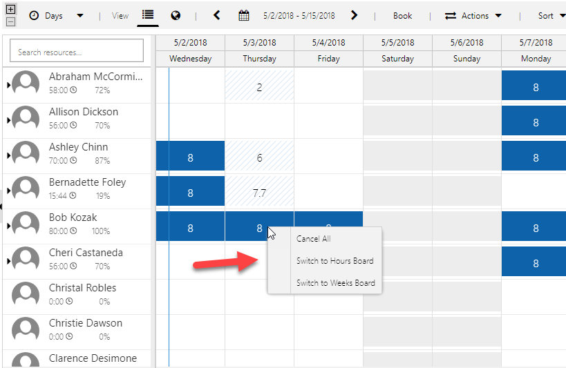 Now, when finding availability on the multiday Schedule Boards, your decision to ignore proposed bookings or to consider proposed bookings will be reflected in the total available hours displayed on the schedule board.