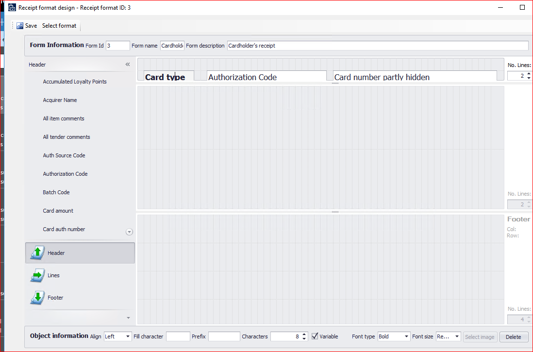 When I add the fields “Customer Type”, “Authorization Code” and “Card number partly hidden” to the Customer Receipt format, the fields will not print the when the Customer Receipt is printed and a paying with a credit card. These fields are only available in the Header of the receipt and they should be available in the Footer.