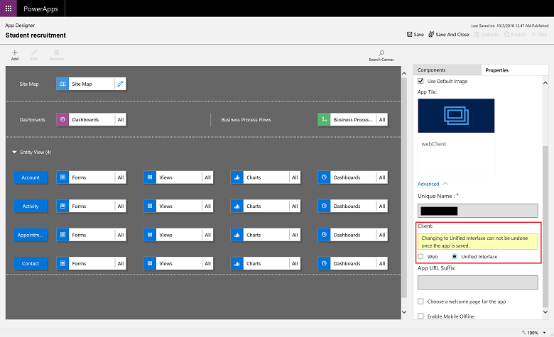 - When creating a new app module, you will only have the option to do so based on the Unified Interface. You will no longer be able to create new app module based on legacy experience.
