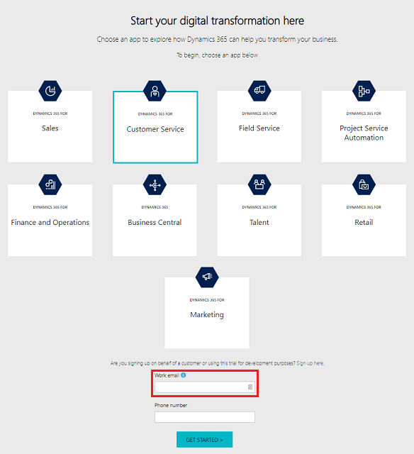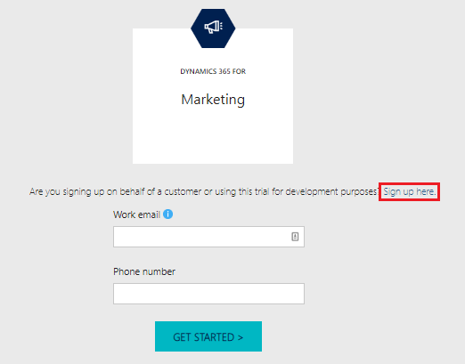 Go to https://trials.dynamics.com and sign up for a trial using your work email.